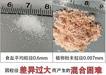 例如下圖中的大顆粒鹽粉與小顆粒的植物粉混合,因其粒徑差異較大,給均勻混合帶來困難: