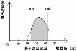 流動性不好和流動性特別好都會影響混合均勻的進程,只有流動性介于堆粉角在25度~42度之間的粉體適合均勻混合進程順利進行。如下圖: