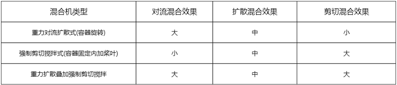 上述三種混合作用是不能決然分開的,各種混合機都是以上述三種作用的某一種作用起主導作用。各種混合設備由于結構不同,混合效果有顯著差別(見下表)。