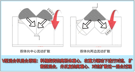 通過機械力不斷抬高粉體重心,利用重力迫使粉體反復向下進行流動、擴散、對沖、折疊等運動的混合方法。其作用是宏觀上使粉體之間相互摻和、滲透,從而達到混合均勻的目的。代表機型:V型混合機、三維混合機、雙錐機等。