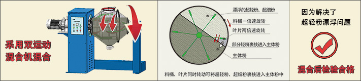 針對輕粉、超輕粉因漂浮而難以均勻混合的特性,應(yīng)該選用具有將輕粉、超輕粉強制混入主體粉能力的混合設(shè)備。