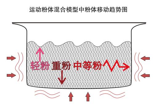 定義:在外力的作用下容器內的粉體發生激烈運動,在運動粉體中粉體顆粒之間相互摻和混合的過程中出現了液態化特征,即粉體顆粒因自身的因素會在主體粉中出現“上浮”、“下沉”、“懸浮”現象。這種粉體的運動模式就是運動粉體液態化混合模型如下圖。