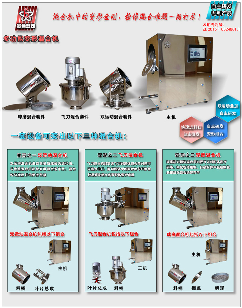多功能變形混合機(jī)機(jī)型特別適合于實驗室使用,其精巧機(jī)身加多種組合方式展現(xiàn)出三種設(shè)備的強(qiáng)大功能,正常粉體可采用高效雙運動?混合方式,有板結(jié)顆粒、假顆粒、纖維狀組織可采用高速飛刀打散混合方式,有大顆粒粉體、需要精細(xì)研磨粉體可采用球磨混合方式。