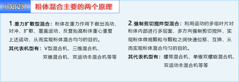 其混合性能各有顯著缺陷(如:重力擴散型混合機代表機型V型機、三維機,缺點是粉體微觀處缺乏充分剪切、位移,混合效率低;強制剪切型混合機代表機型螺帶混合機、單錐混合機,缺點是有物料死角,粉體宏觀移動速度慢)。