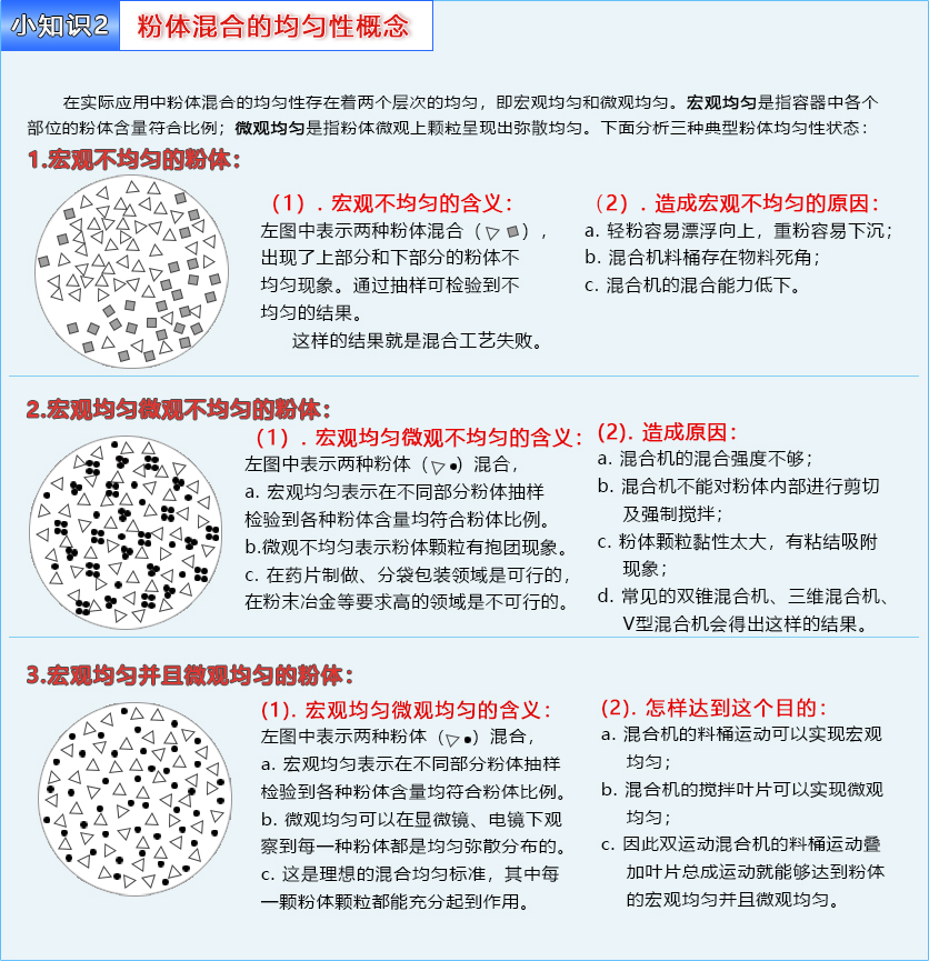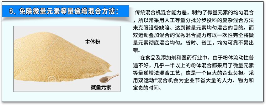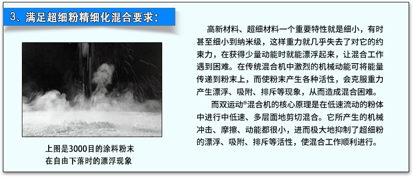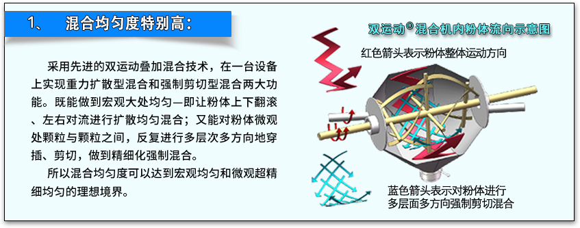 采用先進的雙運動疊加混合技術,在一臺設備上實現重力擴散型混合和強制剪切型混合兩大功能。既能做到宏觀大處均勻—即讓粉體上下翻滾、左右對流進行擴散均勻混合;又能對粉體微觀處顆粒與顆粒之間,反復進行多層次多方向地穿插、剪切,做到精細化強制混合。所以混合均勻度可以達到宏觀均勻和微觀超精細均勻的理想境界。