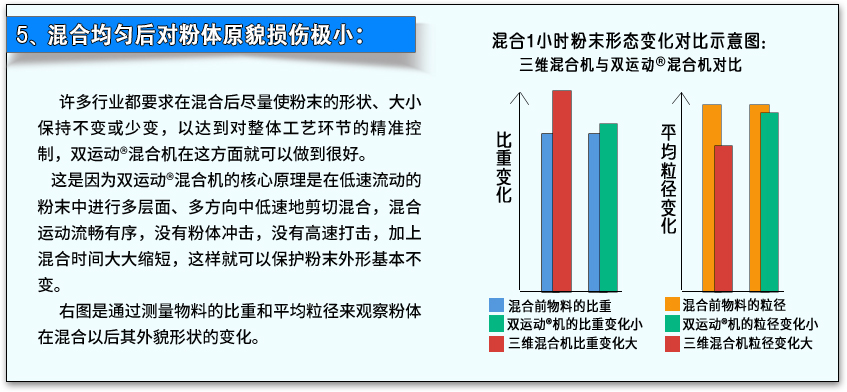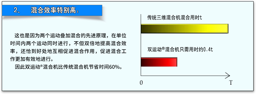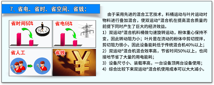 這也是因為兩個運動疊加混合的先進原理,在單位時間內兩個運動同時進行,不但雙倍地提高混合效率,還恰到好處地互相促進混合作用,促進混合工作更加有效地進行。因此雙運動混合機比傳統混合機節省時間60%。