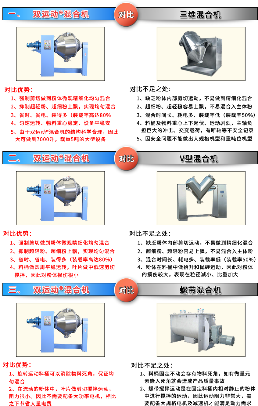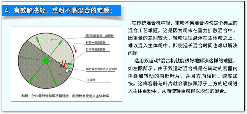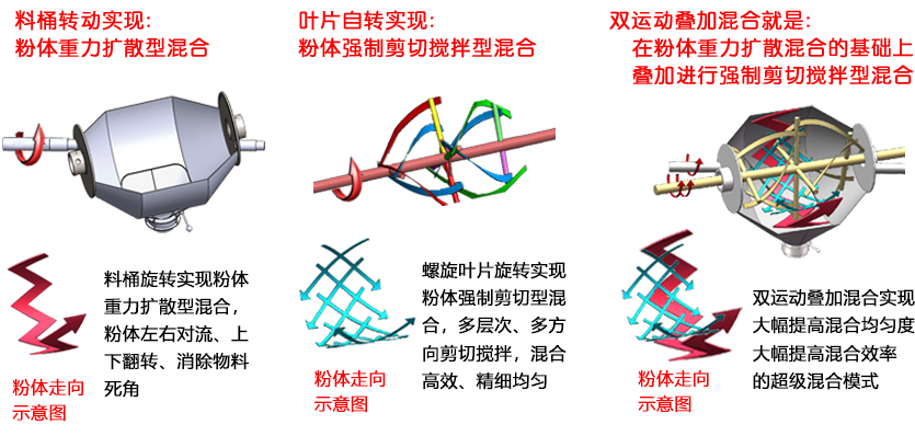我們的設計團隊針對上述問題榮譽研發出雙運動混合機,其問世很好地解決了傳統混合機存在的各種缺點。雙運動混合機開創了全新的混合理念,大幅度提高混合效率!!!