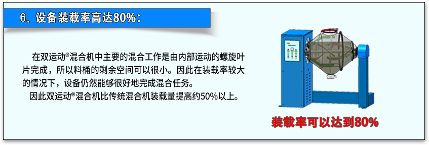在雙運動混合機中主要的混合工作是由內部運動的螺旋葉片完成,所以料桶的剩余空間可以很小。因此在裝載率較大的情況下,設備仍然能夠很好地完成混合任務。因此雙運動?混合機比傳統混合機裝載量提高約50%以上。